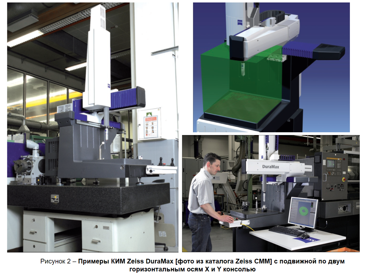 Наиболее распространенной является конструкция КИМ, в которой подвижная консоль выполняет перемещения по двум горизонтальным осям X и Y, а измеряемая деталь устанавливается на неподвижное основание или стол (рисунок 1 а). Примером такой компоновки является КИМ Zeiss DuraMax (рисунок 2).