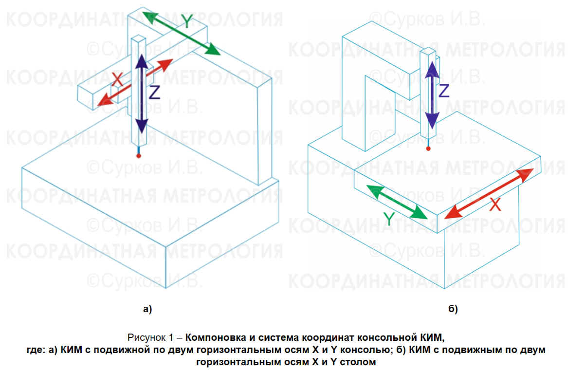 Консольная компоновка КИМ и КИС характеризуется наличием подвижной (рисунок 1 а) или неподвижной (рисунок 1 б) горизонтальной консоли, на которой установлена вертикально перемещающаяся пиноль с измерительной головкой (ИГ). В современной координатной метрологии такая компоновка рекомендуется для производственного контроля в цеховых условиях. КИМ консольной компоновки обладают удобным доступом в рабочее пространство для установки и снятия детали, обеспечивается хороший обзор во время процесса измерения.